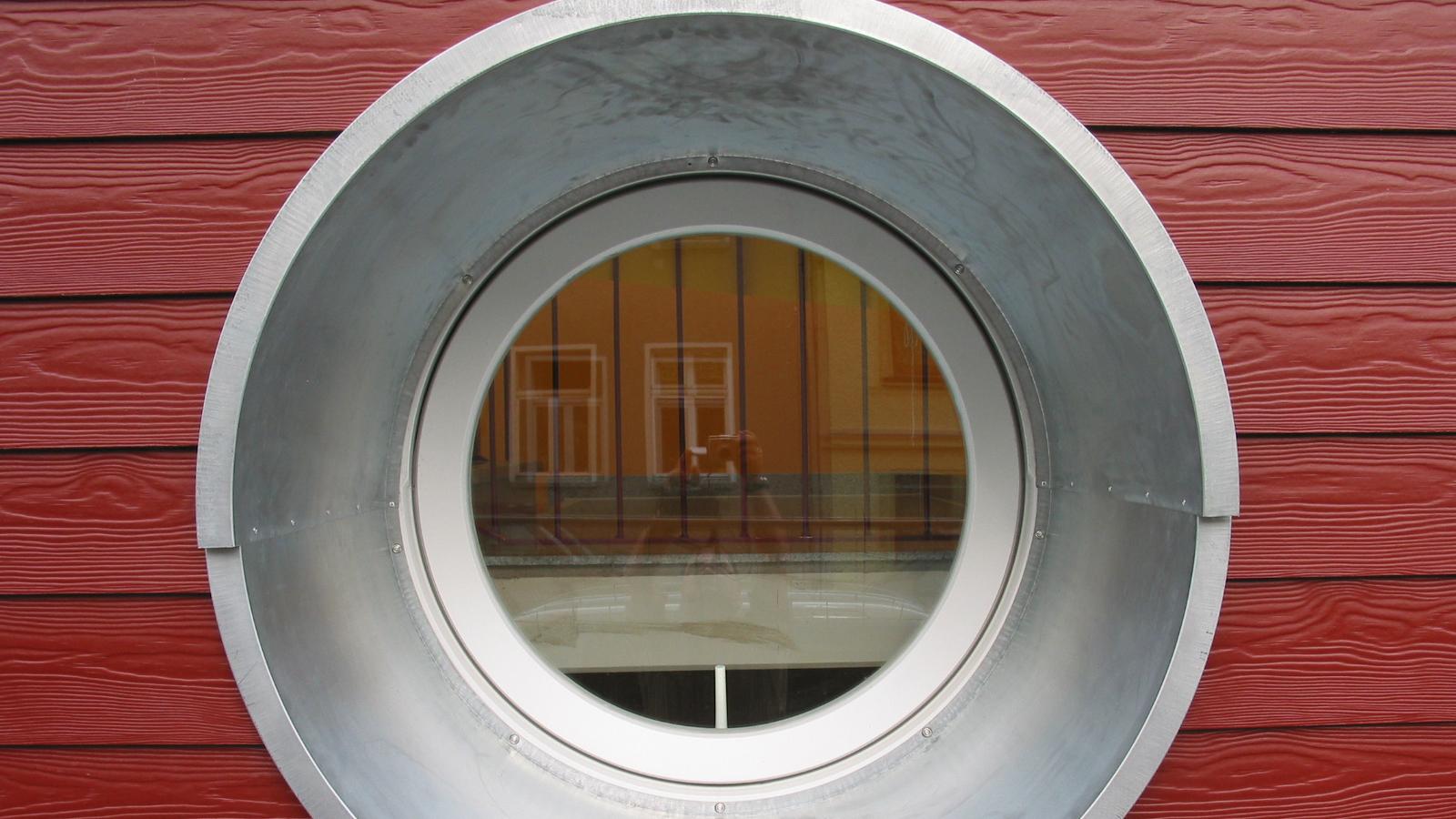 "Schiffsrumpf" am Neubau mittels einer gewölbten Eternitverschalung in Holzoptik und Bullaugen verstärken das biblische Motiv der gestrandeten Arche auf der Dominsel