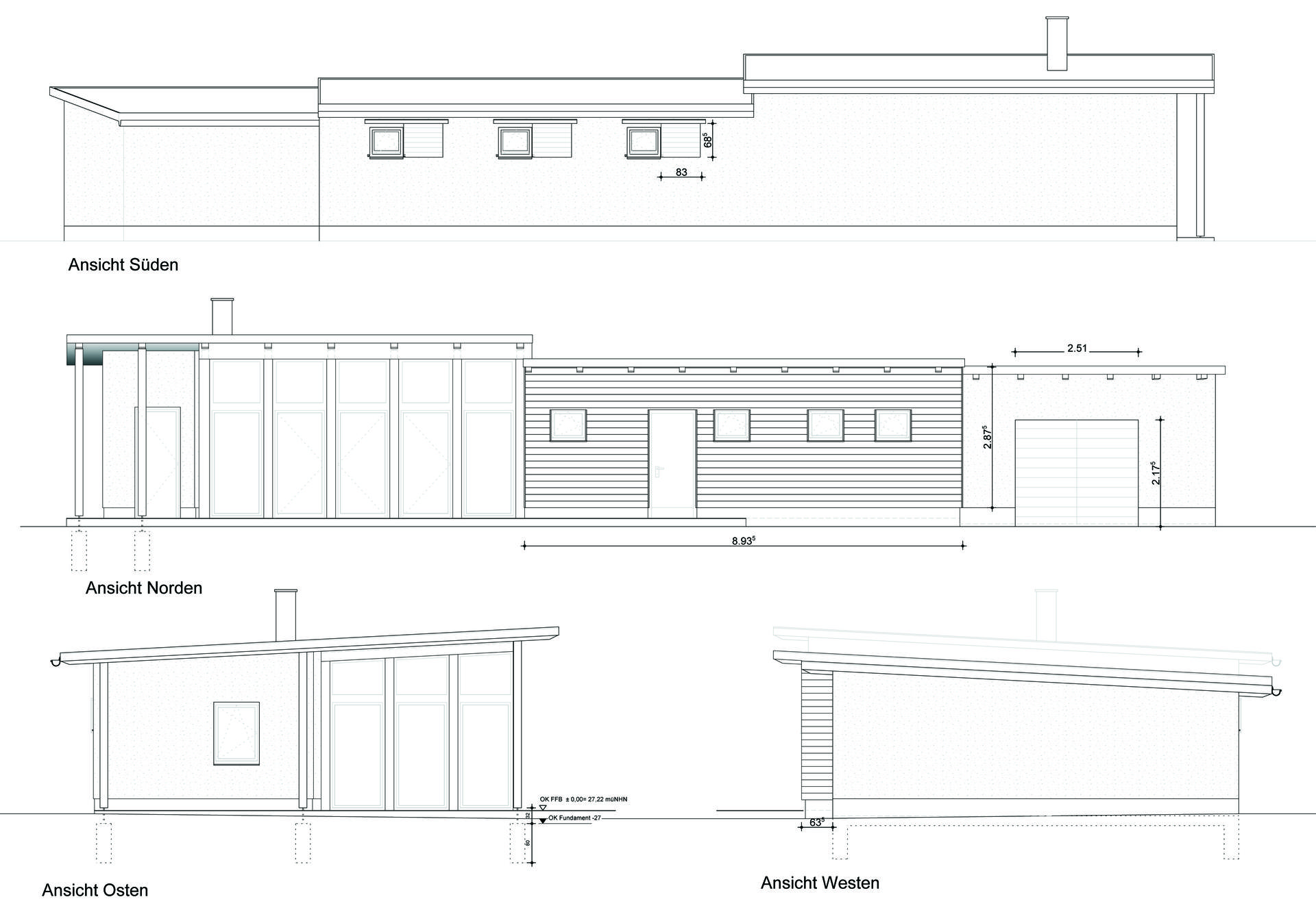 Gliederung durch unterschiedliche Höhen der Pultdächer und Verwendung verschiedener Fassadenverkleidungen