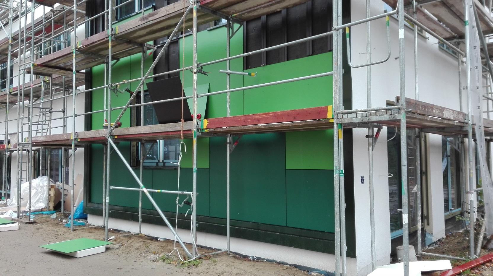 Zur Gestaltung der Fassaden wurde teilweise eine Vorhangfassade aus Trespaplatten montiert.
