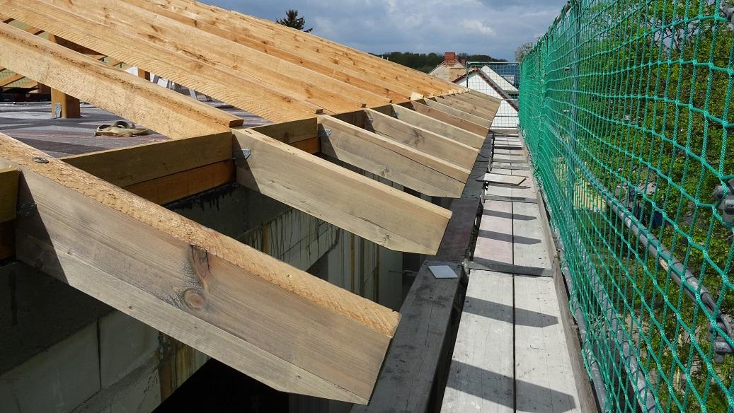 Alle eingeschossigen Gebäudeteile, sowie Erker und Gebäudevorsprünge erhalten Flachdächer mit umlaufender Attika. Den oberen Abschluss des Hauthauses bildet ein flach geneigtes Pfettendach (ca. 18°) mit Ziegeleindeckung. Der Dachraum bleibt ungenutzt und kalt. Die Dämmung erfolgt auf der letzten Geschossdecke.