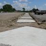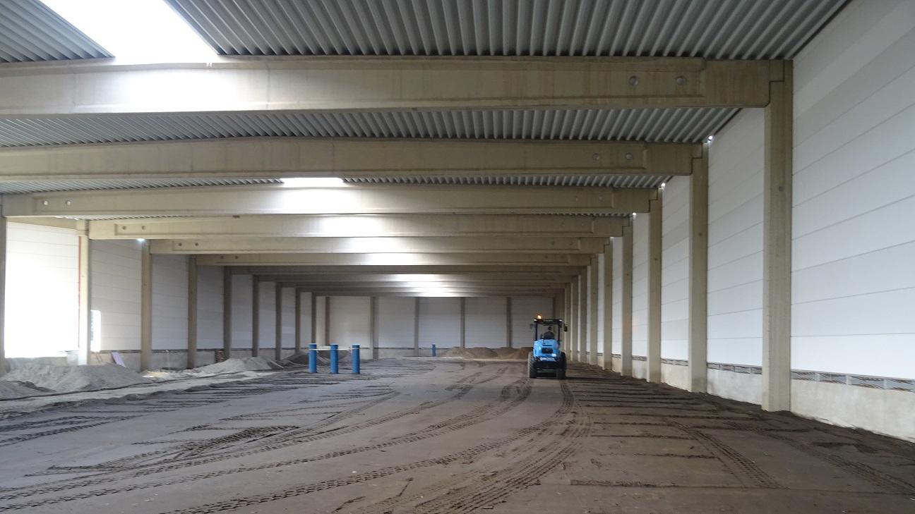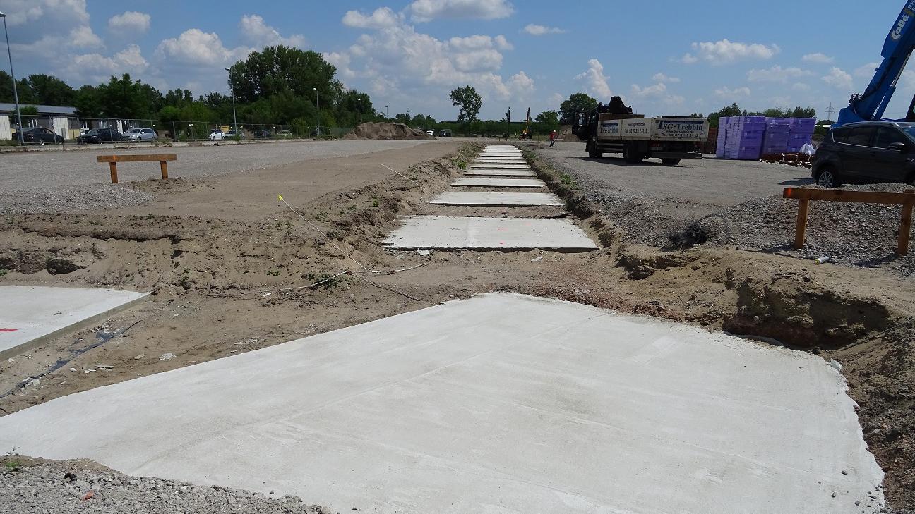 Für eine Rampenentladung der LKW´s wurde die Bodenplatte der unbeheizten Logistikhalle 1.10 m über Oberkante Gelände hergestellt, dazu wurde 3.500 m³ Auffüllung zwischen die Wände der Halle eingebracht.
