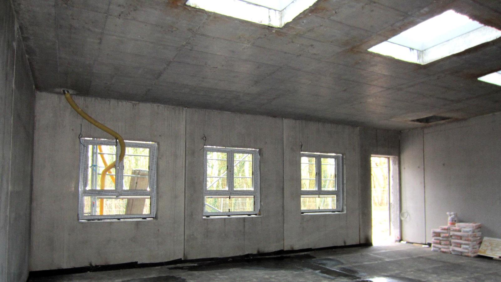 Die Tragkonstruktion der Werkstatt besteht aus vorgefertigten Stahlbetonfertigelementen mit integrierter Dämmschale in den Außenwänden.