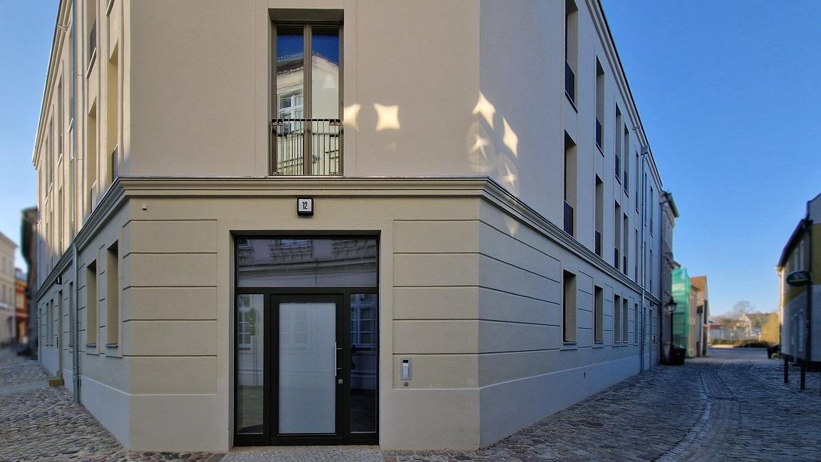In der Innenstadt von Brandenburg an der Havel zwischen Bestandsgebäuden und in der unmittelbaren Nähe von Denkmälern entstand ein 4-geschossiger Neubau. Das oberste Geschoss springt als Staffelgeschoss zurück, die Straßenfassade ist deutlich gegliedert mit Gurtgesims, oberes Abschlussgesims, Fensterumrahmungen und horizontalen Trapezprofilen als nachgebildeter Bossenputz.