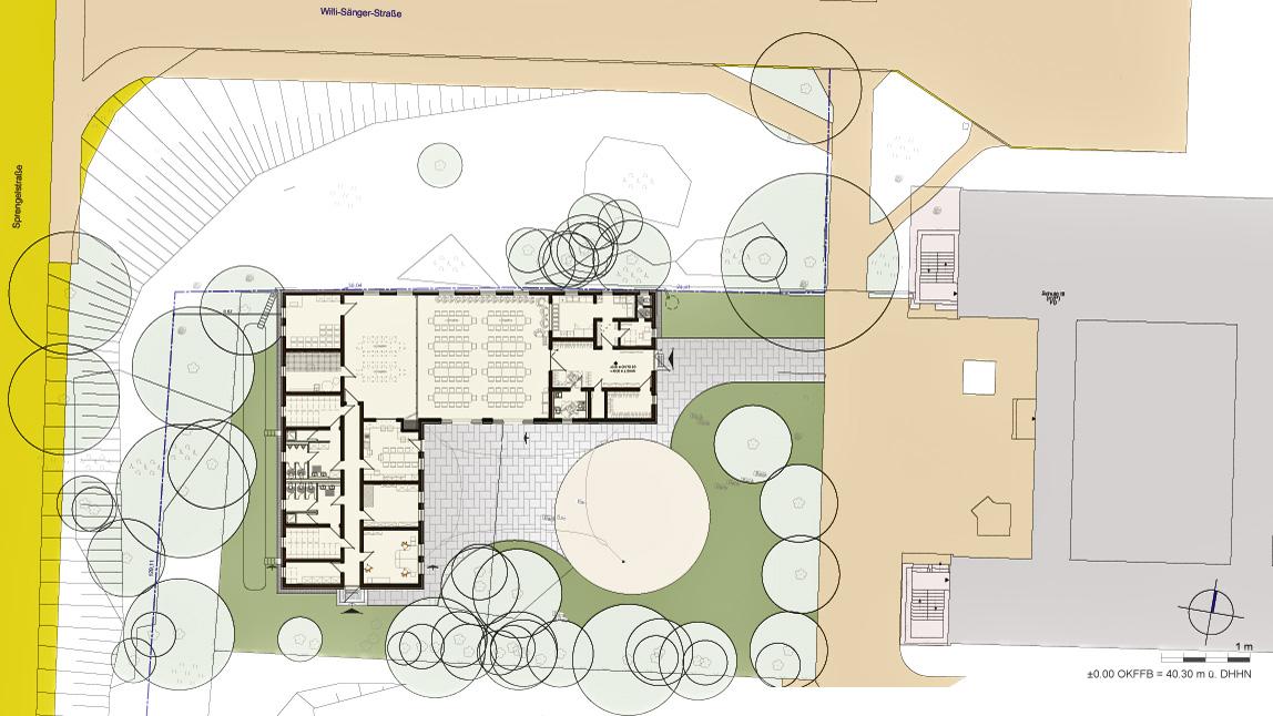 Darüber hinaus sind Umkleideräume für ca. je 18 Jungen und Mädchen mit den entsprechenden Sanitäranlagen und eines jeweils zugehörigen Duschplatzes, eine Lehrerumkleide, eine Lehrküche für 15 Schüler, ein Verwaltungsbereich mit Büro und Archiv, ein HA-Raum sowie ein Behinderten- WC und ein Garderobenbereich angedacht.