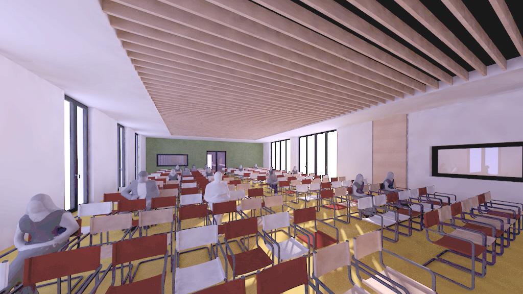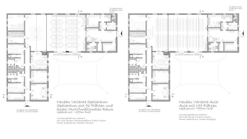 Ziel des Neubaus soll primär die Schaffung eines Speiseraumes für 96 Personen mit Ausgabeküche (Cook & Freeze) bzw. einer Aula für 199 Personen mit Technikraum und Stuhllager sein. Für den Aula- Bereich ist ein großer stützenfreier Raum erwünscht, welcher für besondere schulische Veranstaltungen genutzt werden kann. Da für die Nutzung als Mensa eine kleinere Fläche ausreichend ist, soll der große Raum mittels einer mobilen Trennwand unterteilt werden. Somit ist eine flexible und parallele Nutzung der Räumlichkeiten möglich.