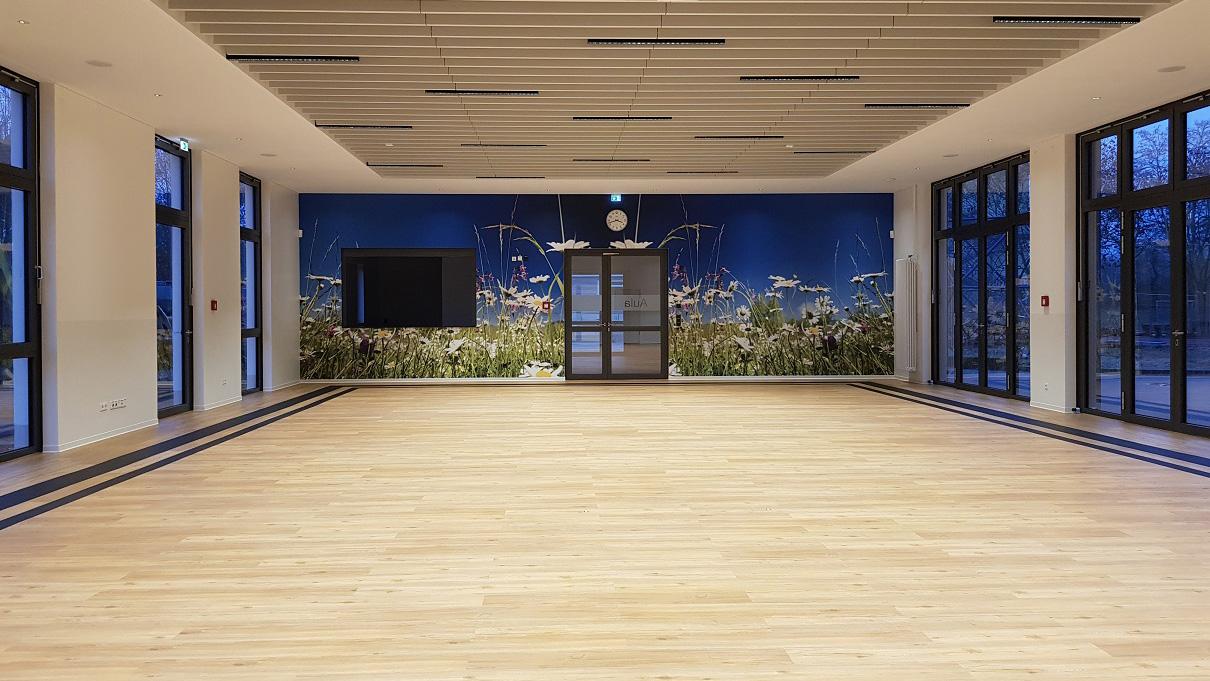 Die lichte Raumhöhe im Aula- bzw. Speiseraum beträgt 3,50m.